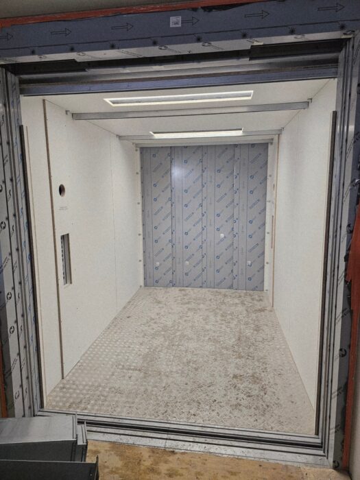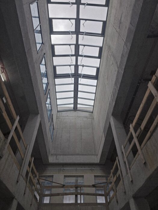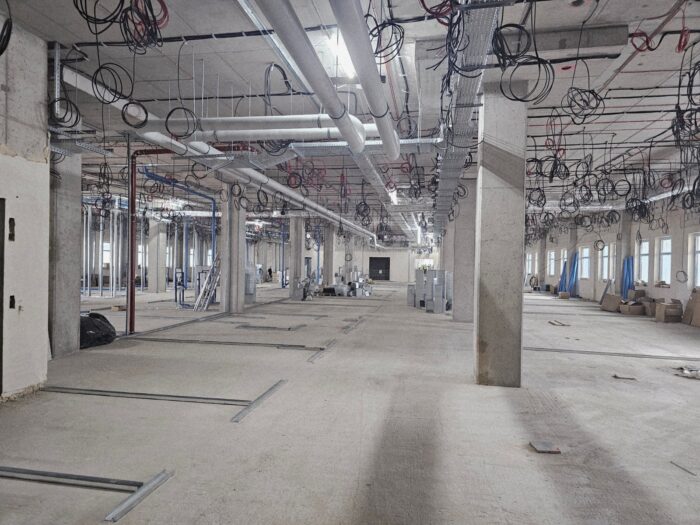 Bryła budynku jest już w dużej mierze ukształtowana. Prace elewacyjne na kolejnych skrzydłach są już na ukończeniu, a całość coraz wyraźniej pokazuje docelowy kształt nowego szpitala. Równolegle intensywnie prowadzone są roboty wewnątrz budynku: powstają ściany, instalacje techniczne i kolejne elementy infrastruktury niezbędnej do funkcjonowania nowoczesnego, kompleksowego szpitala. Na budowie pojawiły się pierwsze elementy wyposażenia, zamontowano windę towarową, która przechodzi obecnie testy, a strefa dostaw jest już gotowa.